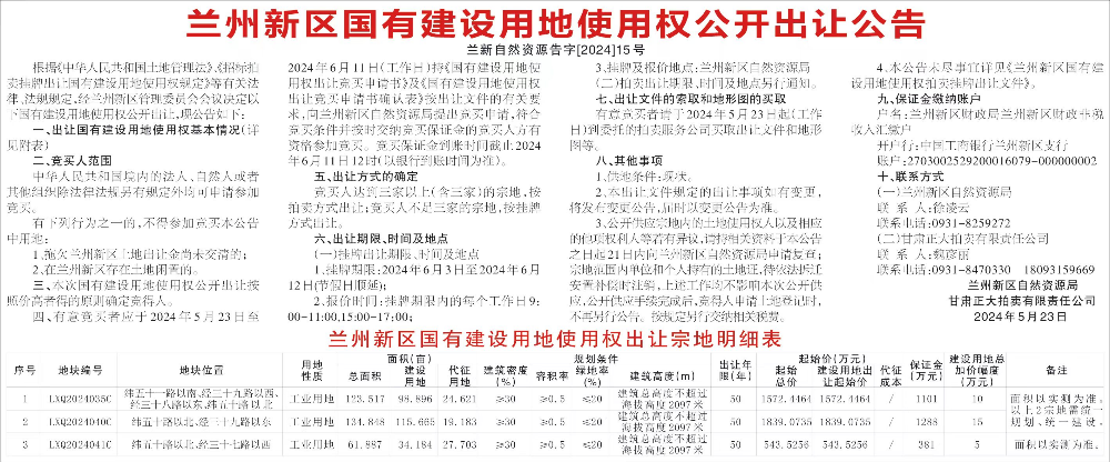 兰州新区国有建设用地使用权公开出让公告 兰新自然资源告字〔2024〕15号-捕鱼网