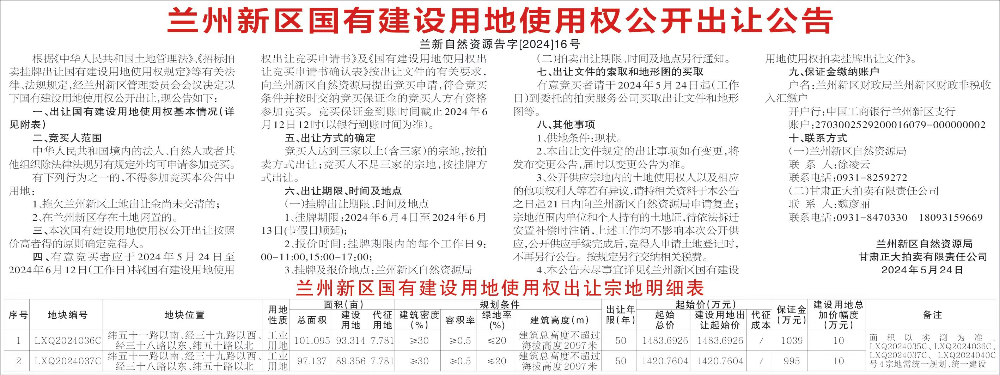 兰州新区国有建设用地使用权公开出让公告 兰新自然资源告字〔2024〕2号-捕鱼网