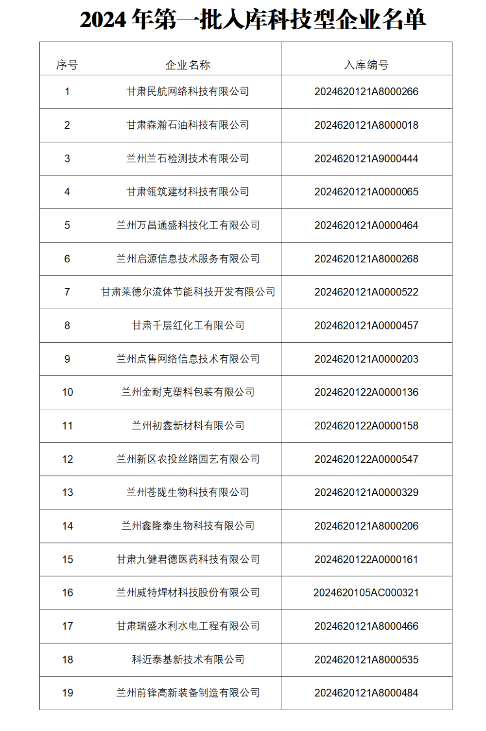 2024年7月31日,甘肃省科学技术厅公布了甘肃省2024年度第一批入库科技型中小企业名单的通知,兰州新区有19家企业取得“登记编号”,具体名单如下。