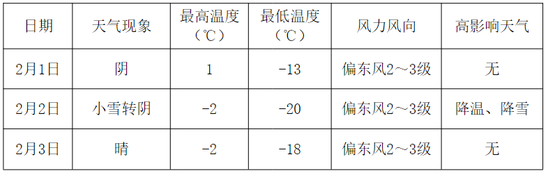 预计2月1日,受波动气流影响,新区天气以阴为主;2日清晨至夜间,受冷空气影响,新区有降雪降温天气;3至7日,受西北气流影响,新区天气以晴为主,气温缓慢回升,但仍然较低。