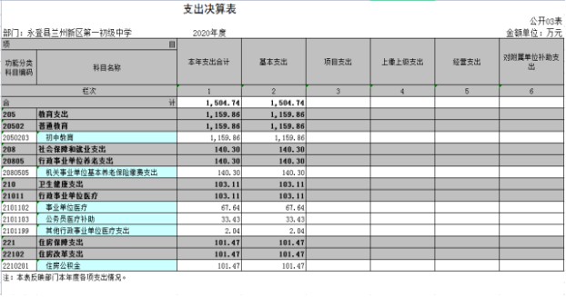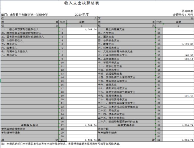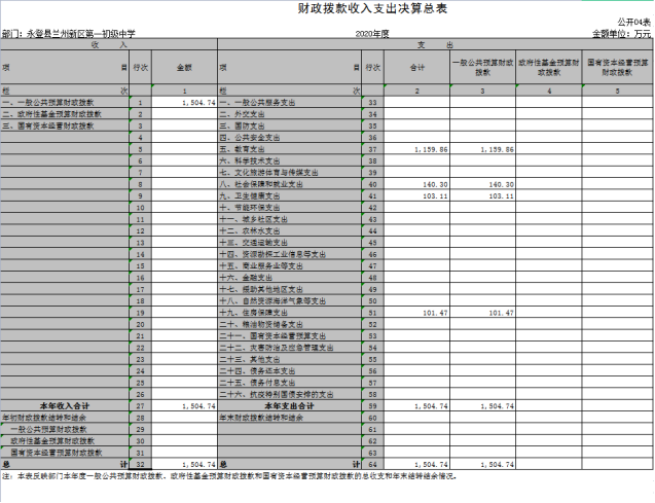 2020年度收、支总计1,504.74万元。收、支较上年决算数增加1,504.74万元,增长100%,主要原因是兰州新区第一初级中学自2017年8月至2019年12月,所有经济活动由兰州新区中川学区代管。根据上级文件精神自2020年1月起作为独立预算决算单位,学校人员和学生人数由兰州新区中川学区根据实际划拨,各项经费收支由我校独立完成。