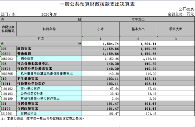 2020年度总支出1504.7万元,其中人员经费支出1401.5万元占总支出比例93.14%、公用经费支出103.2万元占总支出比例6.86%。