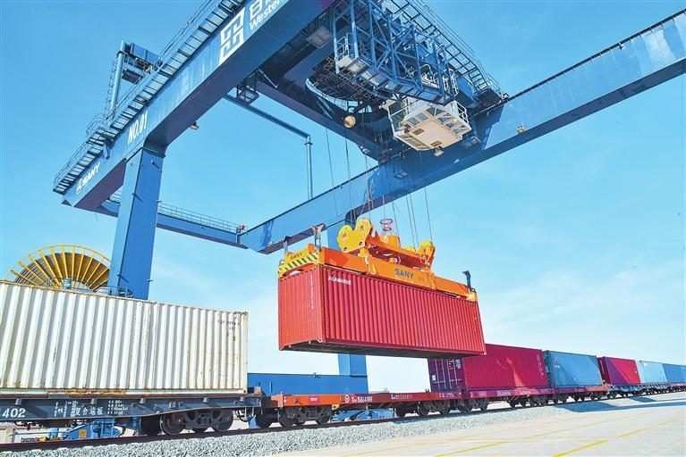 中亚班列抵达新区中川北站物流园后工作人员正在卸载集装箱。