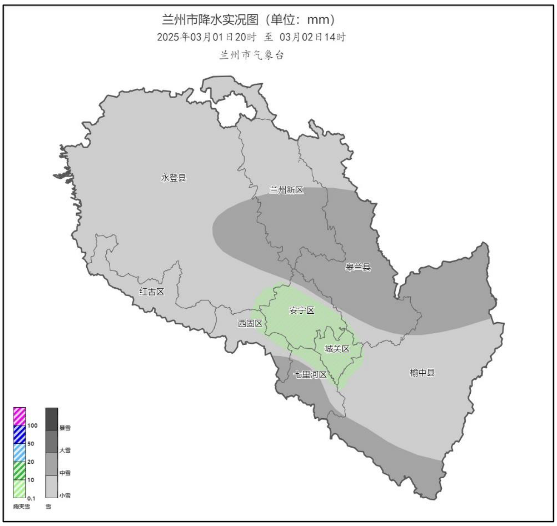 降雪:1日20时至2日14时,我市出现降雪天气。七里河南部、西固南部、皋兰南部、榆中南北山区及兰州新区南部出现中到大雪,其余各地小雪或雨夹雪。过程最大降雪量出现在西固关山6.2毫米(雪深5厘米),其余各县区最大降雪量(单位:毫米)分别为:榆中上花4.8(雪深4厘米)、永登大同3.1(雪深3厘米)、七里河韩家河3.1(雪深1厘米)、皋兰什川3.0(雪深1厘米)、安宁植物园2.2、红古水车湾1.5。另外,兰州新区中川2.9(雪深1厘米)、皋兰三川口2.9(雪深1厘米)、兰州五里铺2.8、永登城关2.2(雪深1厘米)、榆中三角城1.6(雪深1厘米)。