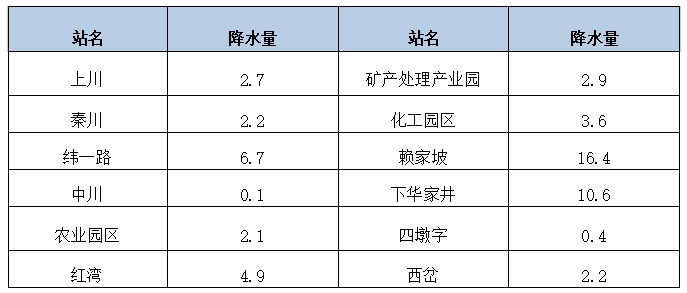 6月3日傍晚开始,全区大部出现降水天气,截至4日07时,最大降水量(单位:毫米)出现在赖家坡16.4,其次为下华家井10.6、纬一路6.7,其它站点在5.0以下。