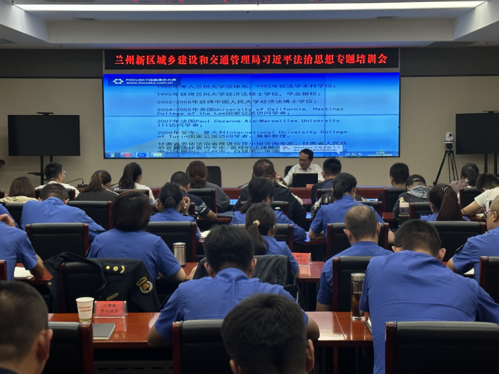 为深入学习贯彻习近平法治思想,持续推进兰州新区城建交通系统法治政府建设,强化行政执法人员的法治意识,9月8日,城建交通局组织开展了兰州新区城建交通系统学习习近平法治思想专题培训会,兰州大学法学院副院长刘光华教授应邀作了专题授课。本次培训以学习贯彻习近平法治思想、强化行政执法能力建设为主题,融学术性、实用性、指导性为一体,对于完整、准确、全面理解和把握习近平法治思想的核心要义,进一步推动今后兰州新区建设交通领域依法行政具有指导意义。新区城建交通局和各园区建设局、各乡镇街道、社区中心城市管理执法人员等共60余人参加了培训。