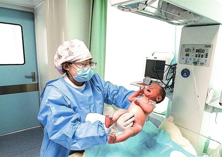 兰州新区第一人民医院产科医生为新生儿做检查。
