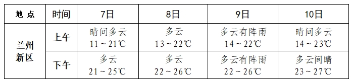 预计6日受高原槽和冷空气共同影响,兰州新区有降温 降水天气;7至10日,受波动气流影响,全区天气以多云为 主,其中8日夜间至9日白天,全区有弱降水。