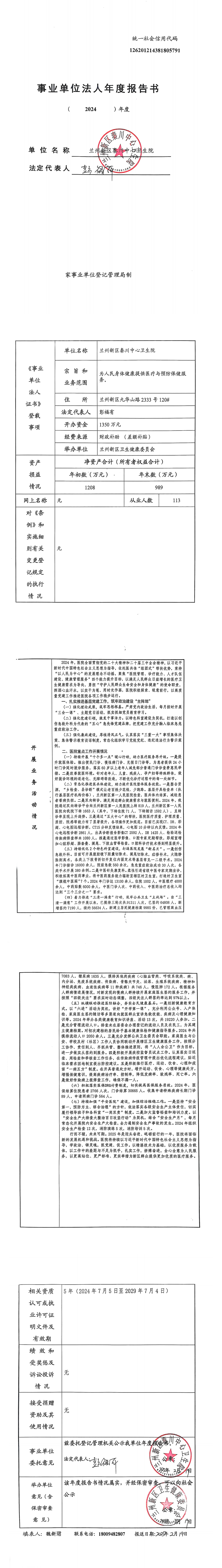 兰州新区秦川中心卫生院2024年事业单位法人年度报告书-捕鱼网