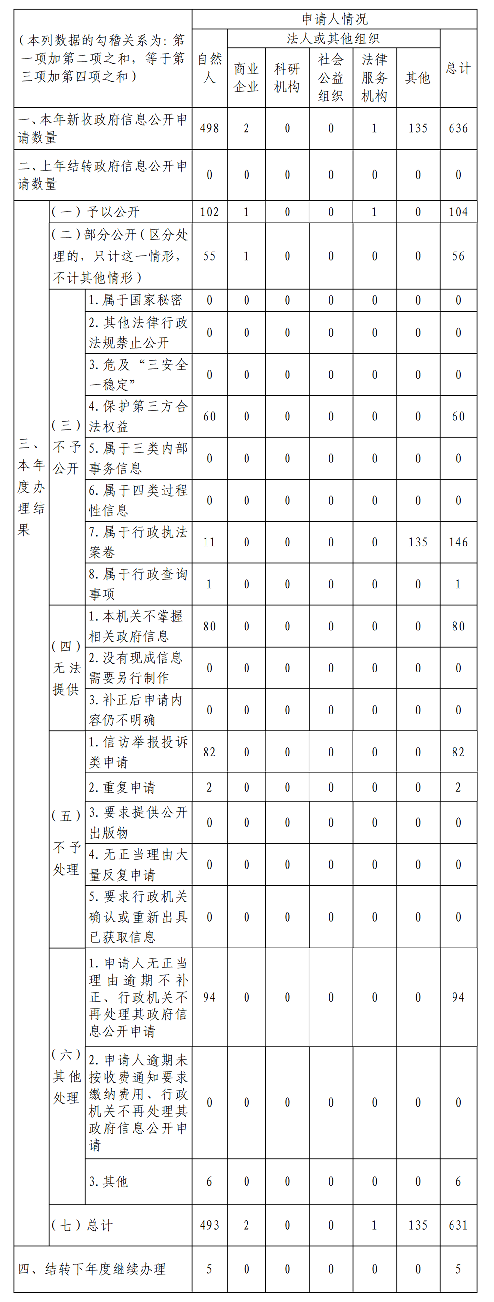 (二)依法办理依申请公开。按照《条例》要求,参照省政府信息公开申请办理答复格式文书,进一步规范了公开申请受理、登记、审核、办理、答复、归档等工作流程。不断完善依申请公开接收渠道和协调会商机制,及时加强同申请人的沟通联系,有效保障公众合理信息需求,确保了依申请公开答复合法合规、解释说明合情合理。持续加大指导释明力度,积极听取申请人需求,引导申请人通过法定途径反映诉求。2023 年,共规范接收、办结依申请公开事项636件,办理631件,结转下年度办理5件,办结率99.21%,未发生被纠错情形。