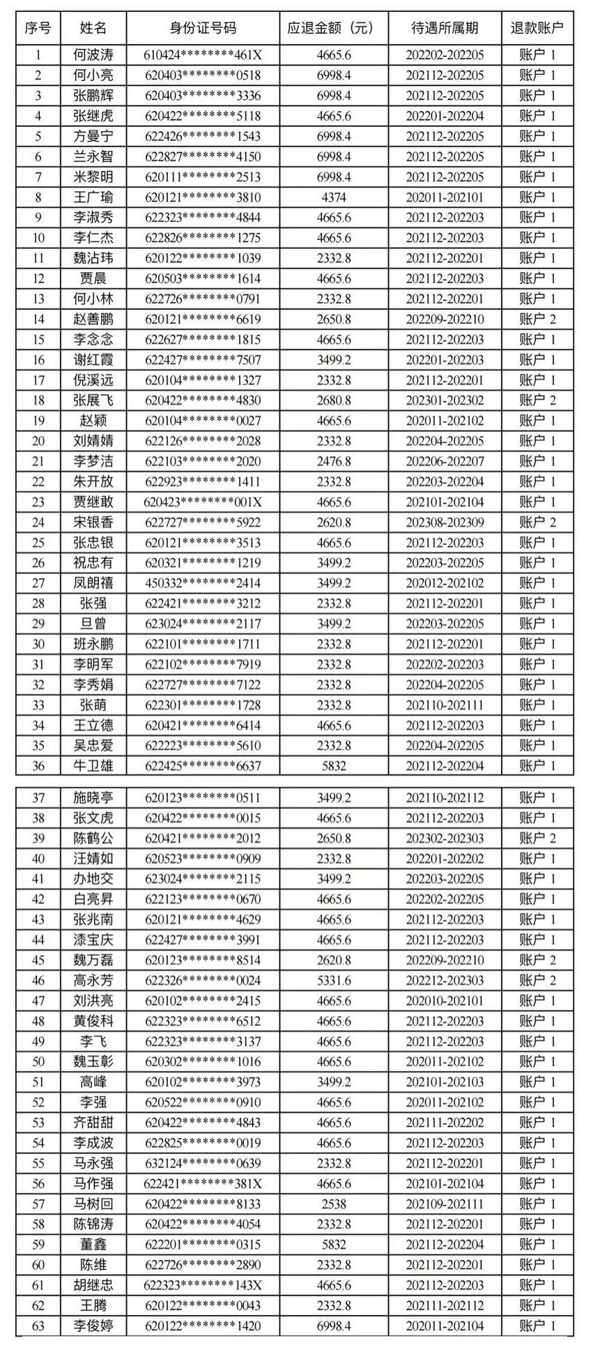 根据《关于失业保险待遇疑点数据核查的工作指南》(人社失业司便函〔2023〕128号)精神,中川园区在开展专项整治行动过程中核实到部分人员在本园区领取失业保险待遇期间存在异地参保就业的情况。前期经短信、电话等方式告知后,仍有63名人员未按规定退费,按照《工作指南》的要求现面向社会进行公告。请涉及人员及时向我园区失业保险经办机构取得联系,办理退款手续。