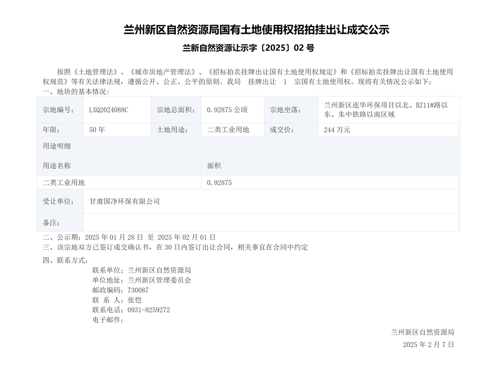 兰州新区自然资源局国有土地使用权招拍挂出让成交公示