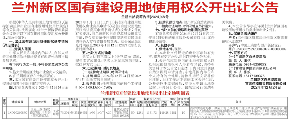 兰州新区国有建设用地使用权公开出让公告 兰新自然资源告字[2024]48号-捕鱼网