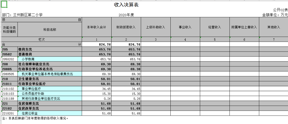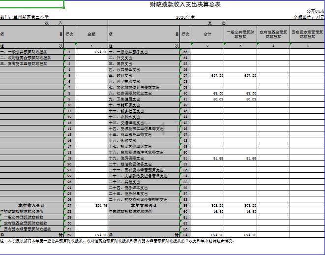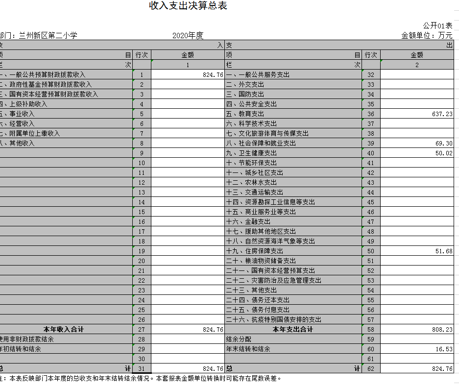 2020年度收、支总计824.76万元。收、支较上年决算数增加824.76万元,增长100%,主要原因是主要原因是兰州新区第二小学自2017年8月至2019年12月所有经济活动由兰州新区西岔学区代管。根据上级文件精神自2020年1月起作为独立预算决算单位,学校人员和学生人数由兰州新区西岔学区根据实际划拨,各项经费收支由我校独立完成。