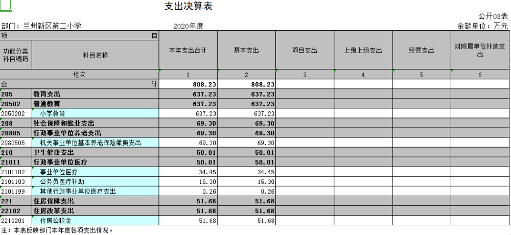 1.教育支出年初预算数为619.49万元,支出决算为637.23万元,较上年决算数增加637.23万元,完成年初预算的102.86%,决算数大于预算数的主要原因是自2020年1月起我校作为独立预算决算单位,学校人员和学生人数由兰州新区西岔学区根据实际划拨,各项经费收支由我校独立完成,并且兰州新区瑞玲名郡学校于2020年9月纳入兰州新区二小核算。