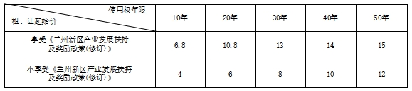 第四条 入驻精细化工园区的企业可自主选择是否享受《兰州新区产业发展扶持及奖励政策》确定优惠政策,选择不同供地价格,按下表执行。(单位:万元/亩)。
