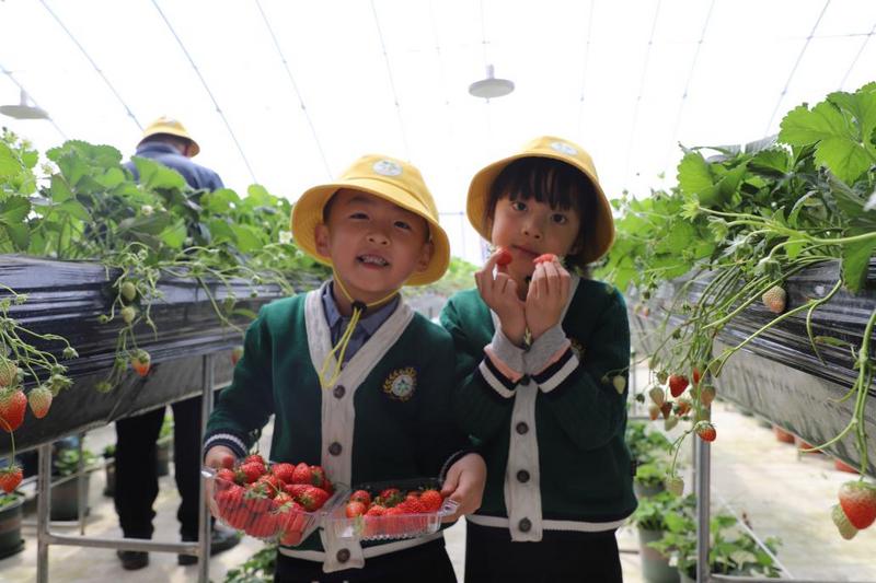 秦川现代农业产业园的草莓种植基地,游客采摘成熟果实。