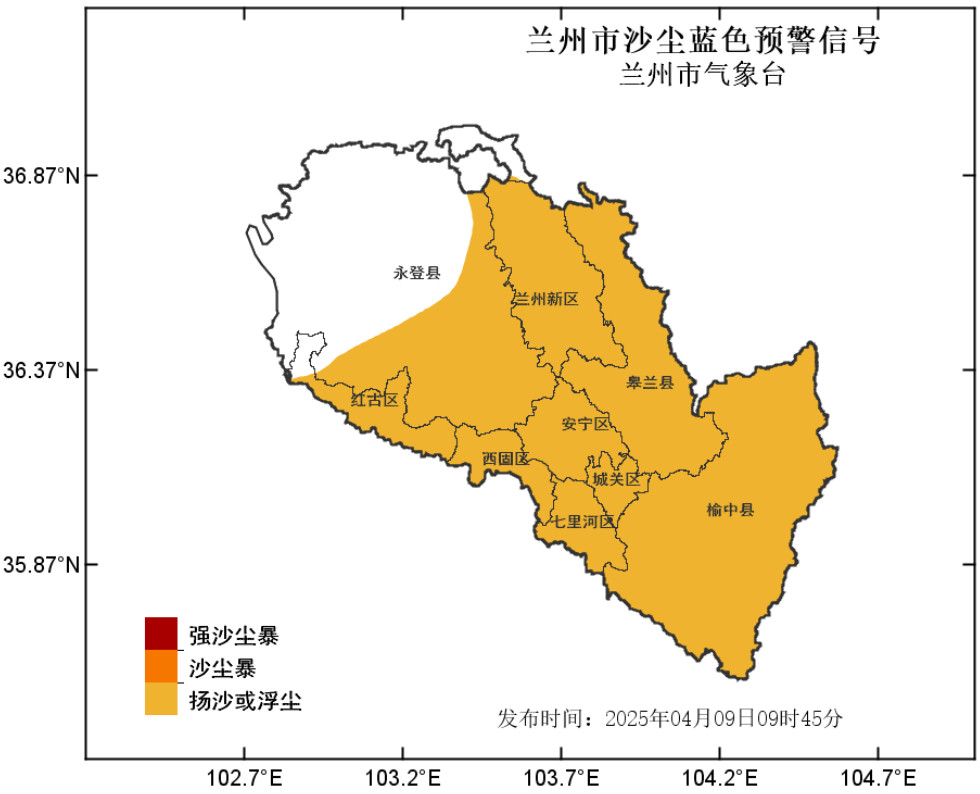 兰州市气象台2025年04月09日09时45分发布沙尘蓝色预警信号:受上游输入性沙尘影响,目前我市大部已出现浮尘天气,预计今天上午至傍晚,城关、七里河、安宁、西固、红古、榆中、皋兰、永登南部及兰州新区持续浮尘天气,并伴有2~3级偏北风,阵风4~5级。请注意防范!
