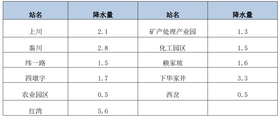 6月7日夜间开始,全区大部出现降水天气,截至8日18时,最大降水量(单位:毫米)出现在红湾5.6,其次为下华家井3.3、秦川2.8、上川2.1、四墩字1.7、赖家坡1.6、化工园区1.5、纬一路1.5,其它站点在1.5以下。
