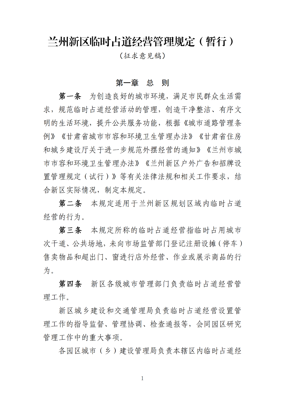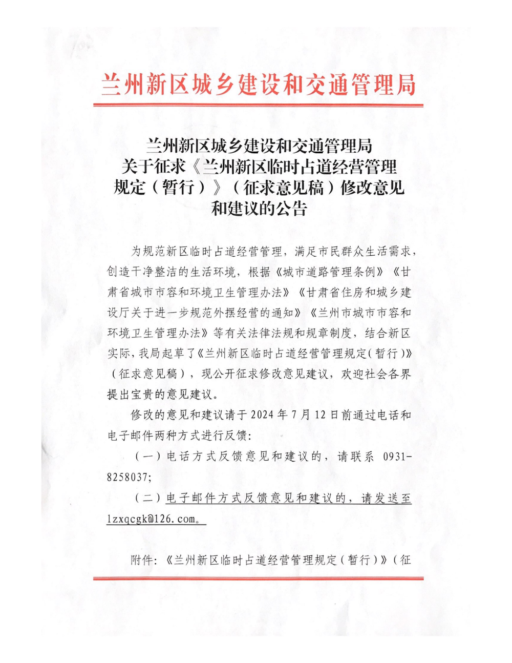 兰州新区城乡建设和交通管理局关于征求《兰州新区临时占道经营管理规定(暂行)》(征求意见稿)修改意见和建议的公告