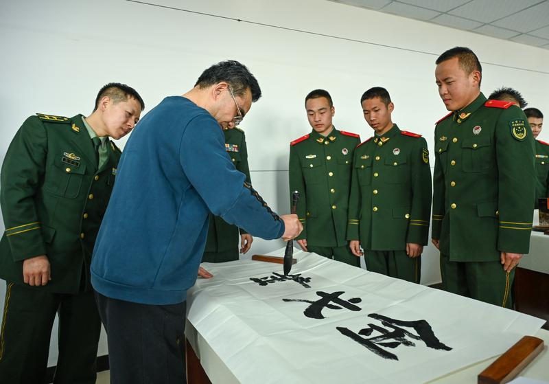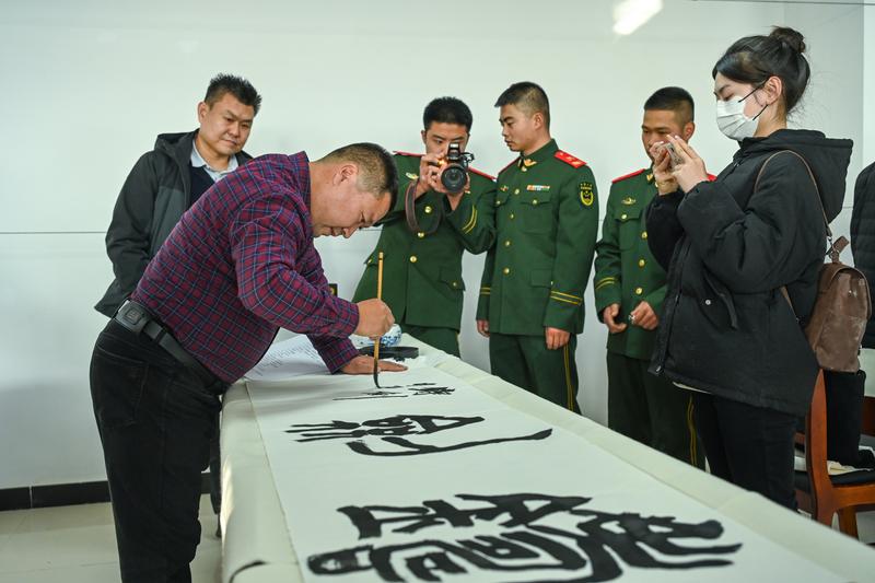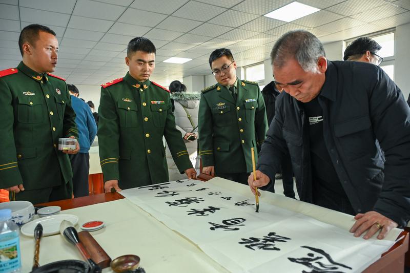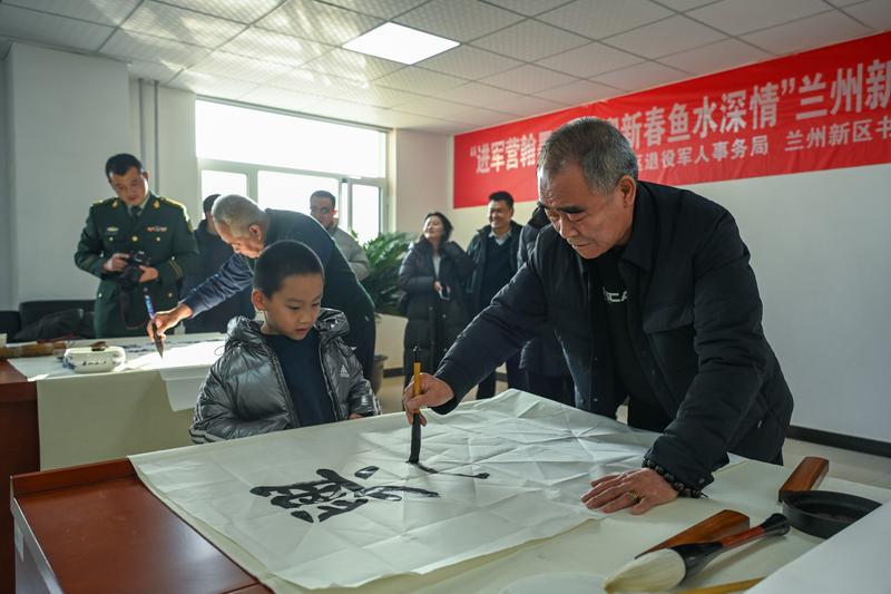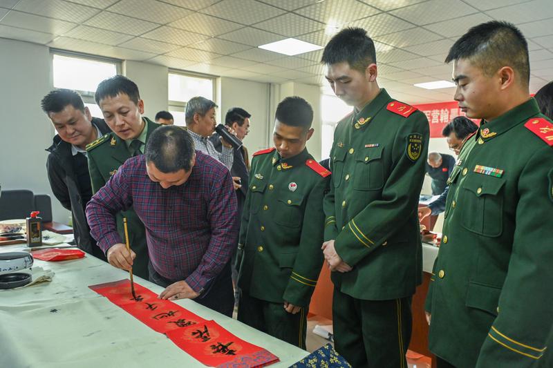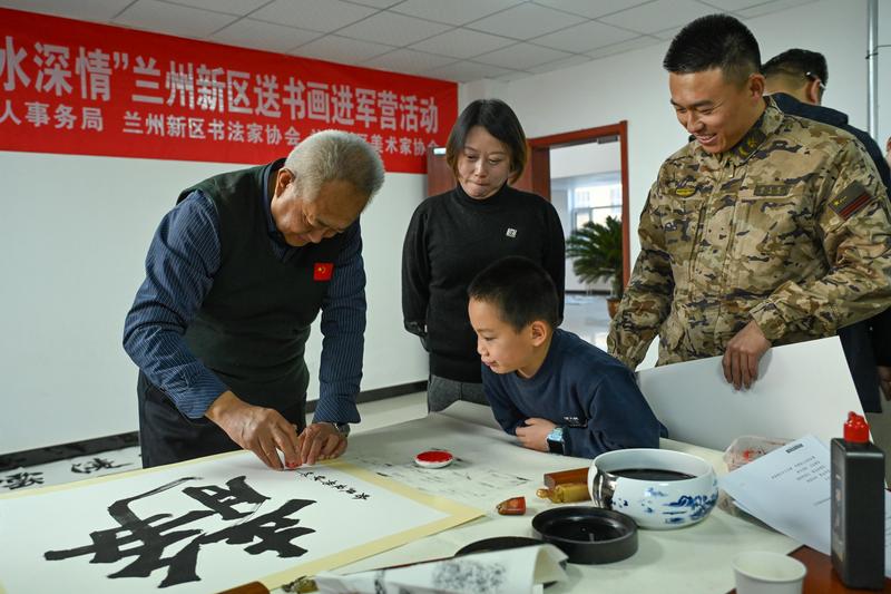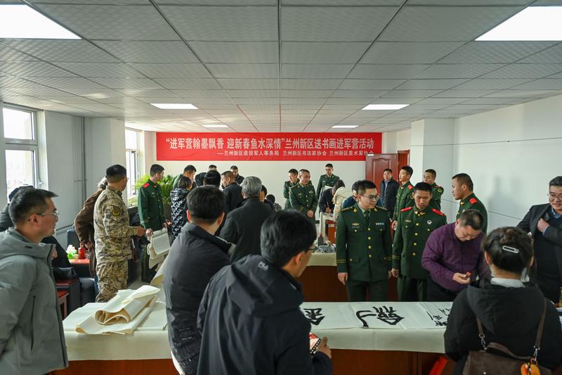 当日,由新区退役军人事务局、新区书法家协会、新区美术家协会联合举行的“进军营翰墨飘香 迎新春鱼水情深——兰州新区送书画进军营活动”将这场慰问推向高潮。书画艺术家们围绕双拥文化主题,弘扬和传承中华优秀传统文化,将军地双拥文化工作引向深入,将书画艺术融于双拥文化之中,将双拥精神带进军营。一个个红红的福字、一张张浓浓的墨香画作饱含军民鱼水情,不仅为官兵们的新春添彩,而且充实了军营日常文化生活。