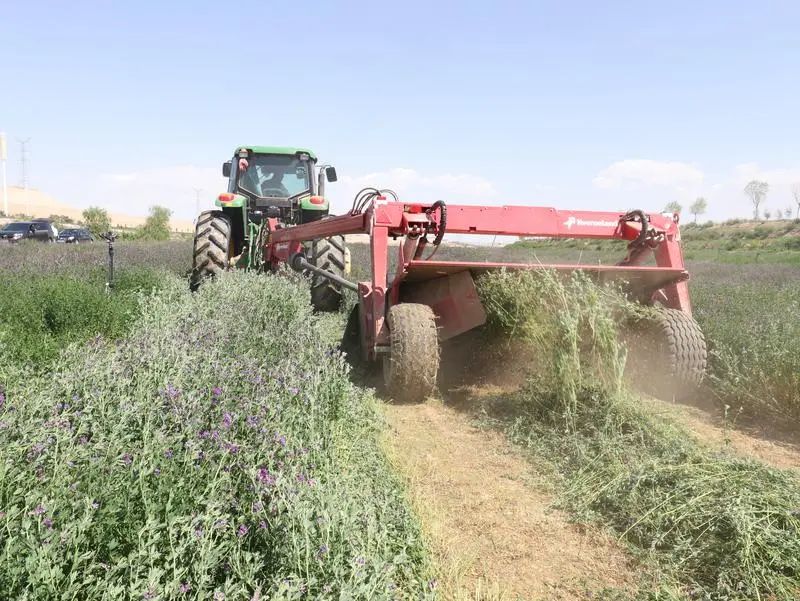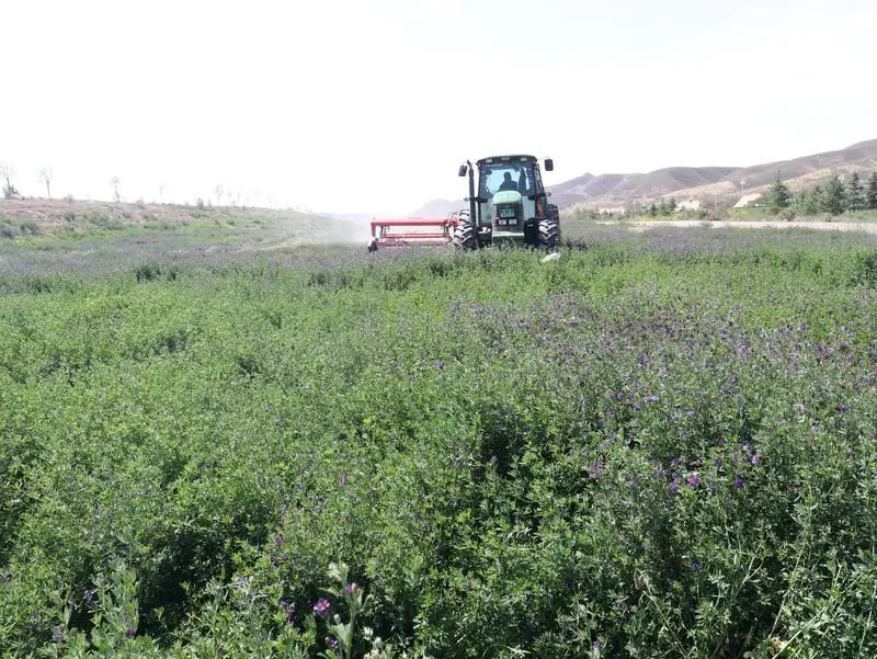 伴随着收割机的阵阵轰鸣,一片片“绿地毯”顿时变成了“条纹毯”,收割后的苜蓿通过晾晒、搂草、打包等一系列工序,就成了牛羊的“草罐头”。