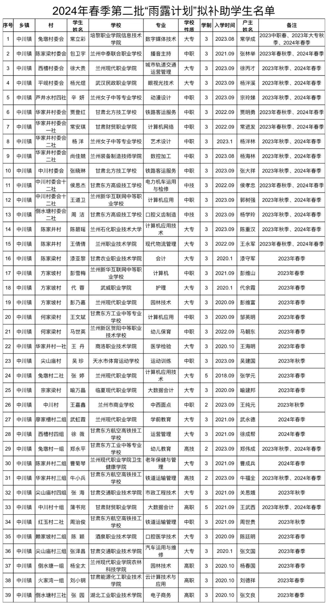 根据《兰州新区农林水务局<关于规范落实“雨露计划”补助资金切实做好排查整改工作的通知>》及《甘肃省扶贫办 甘肃省教育厅 甘肃省人社厅<关于印发进一步做好雨露计划支持农村贫困家庭新成长劳动力接受职业教育的实施意见的通知>》(甘开办发(2019)197号)要求,按照每人每学期1500元的标准,对农村脱贫户(含监测帮扶户)家庭子女接受中、高等职业教育的学生进行职业技能培训补助。现对2024年春季第二批“雨露计划”补助资金进行公示(含2023年春秋季补发)(名单详见附件)。如发现学生学籍、建档立卡户资格方面和公示内容不一致等问题,可通过电话、来信、来访等方式及时反映,以便调查核实。