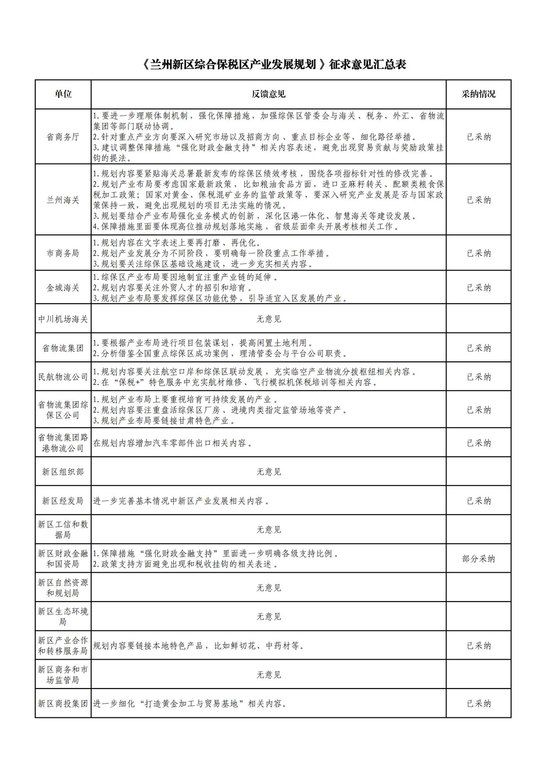 《兰州新区综合保税区产业发展规划 》征求意见汇总表