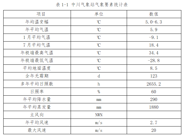 据中川气象站统计资料发现:兰州新区多年平均气温6.5℃,年平均降水量290mm,降雨主要集中分布在7-9月,年均蒸发量1880mm,年日照数2600h,无霜期约在150天左右,最大冻土深度1.46m,主导风向为西北风,年平均风速2.3m/s(见表1-1)。总特征是气候干燥,降水少,日照多,温差大,光能潜力大,四季分明,冬季寒冷干燥,春季多风少雨,夏无酷暑,秋季温凉。