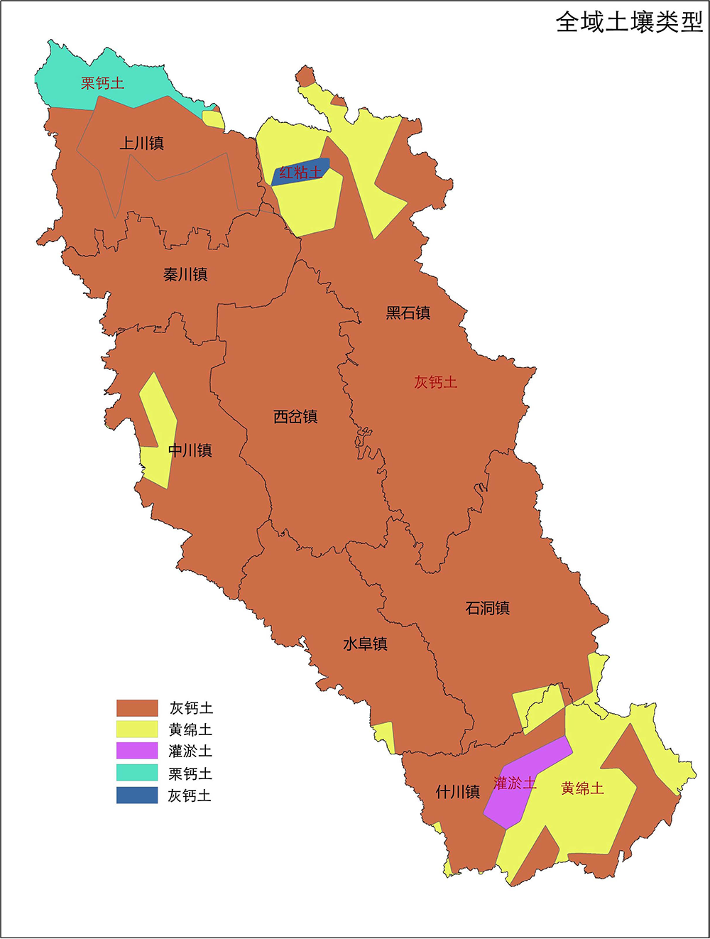 秦王川盆地成土以黄土母质为主,受人类活动影响,区域内主要包括灰钙土、淡灰钙土、盐化灰钙土、黄绵土和红粘土等亚类。灰钙土和淡化灰钙土均为地带性土壤,是发育在深厚黄土母质上暖温带荒漠草原区的弱淋溶干旱土,土壤有机质含量1~2.5%;本区蒸发量是降水量的6~7倍,为盐分向上迁移并聚集地表创造了条件,在北部发育成盐化灰钙土亚类;在新区南部分布有小面积的黄绵土和红粘土,土壤肥力水平较低。北部土壤质地较轻,南部粘重,多为粉质粘土及粘土(见图1-4)。