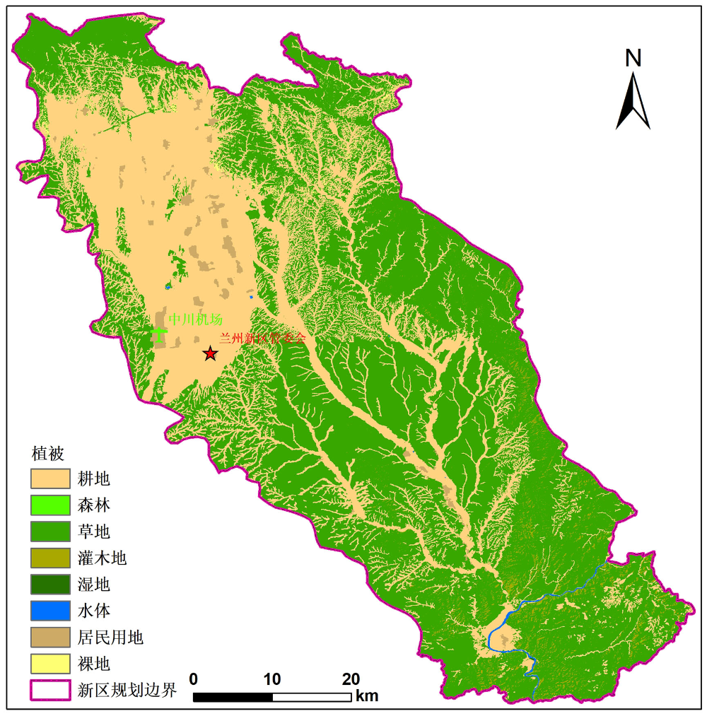 自然植被类型以人工林地和荒漠草原、干旱草原为主,人工林主要分布于中川机场西部,尤其黄河河谷区人工植被较为发育,且历史悠久,主要由经济植物型和蔬菜作物型组成,是兰州市著名的果菜之乡。桃树、枣树及梨树成片成林分布,4、5月份果花盛开,夏秋季节绿树成荫。荒漠草原和干旱草原主要由多年旱生、丛生的禾草、旱生灌木和小半灌木组成。植物主要有蒿草针茅、冰草、柠条等。新区内草地和耕地面积所占比例较大(见图1-5)。