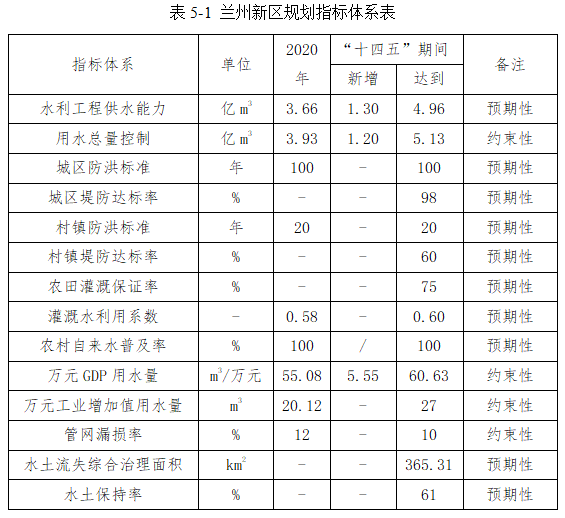 “十四五”规划实施后,兰州新区水利工程供水能力将达到4.41亿m3,城区防洪标准将达到100年一遇,村镇防洪标准将达到20年一遇,农田灌溉保证率将达到75%以上,灌溉水利用系数将达到0.60以上,农村自来水普及率将实现100%全覆盖,万元工业增加值用水量将达到27m3,万元gdp用水将达到60.63m3,管网漏损率将控制在10%以内,完成水土流失综合治理面积365.31km2,再生水利用率将达到35%。