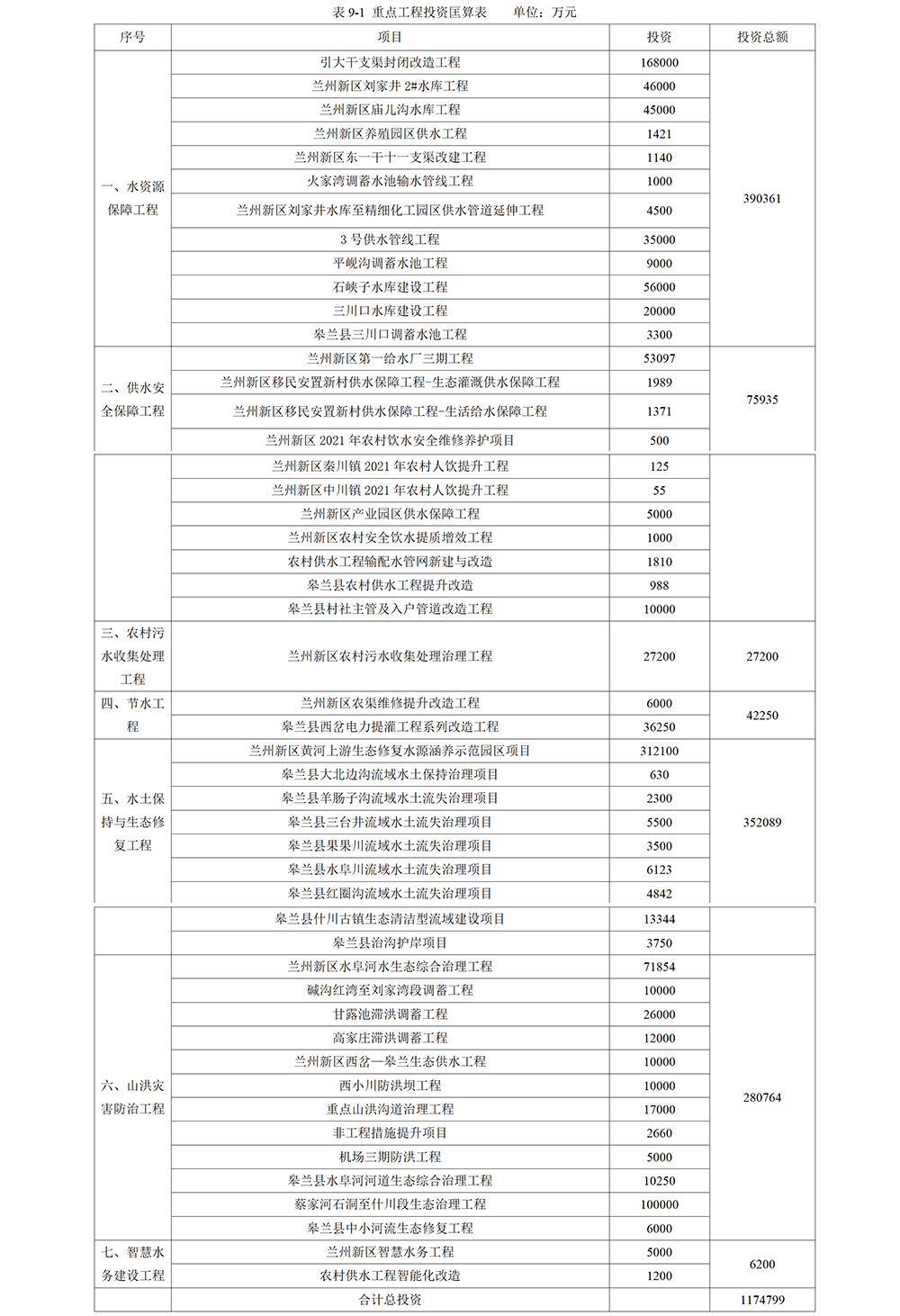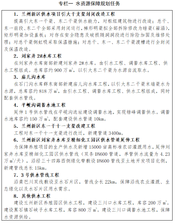 水资源保障工程39.04亿元。主要包括兰州新区供水项目引大封闭改造工程、兰州新区刘家井2#水库工程、兰州新区庙儿沟水库工程、兰州新区养殖园区供水工程、兰州新区东一干十一支渠改建工程、火家湾调蓄水池输水管线工程、平岘沟调蓄水池工程、石峡子水库、西山水库、三川口水库建设工程。