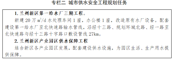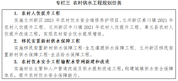供水安全保障工程投资7.59亿元。主要包括兰州新区第一给水厂三期工程、兰州新区移民安置新村供水保障工程、兰州新区2021年农村饮水安全维修养护项目等。