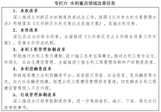 深入推进水权制度改革。结合兰州新区经济社会发展用水需求,深入推进兰州新区水权制度改革试点工作,建立科学的水权制度体系,充分发挥市场机制在水资源配置、水需求调节、强化用水公平和效率等方面的作用。按照《兰州市水权交易管理办法》,积极落实《兰州新区水权交易试点实施方案》,实施水权交易。