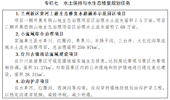 水土保持与水生态修复工程投资35.21亿元。主要包括兰州新区黄河上游生态修复水源涵养示范园区项目、皋兰县大北边沟流域综合治理项目、羊肠子沟流域综合治理项目、三台井流域综合治理项目、果果川流域综合治理项目、治沟护岸项目、什川古镇生态清洁型流域建设项目。