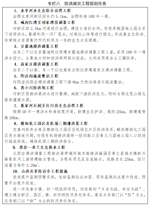 按照“防治结合、以防为主”的思路,努力消除防洪安全隐患,着力补齐防洪工程短板,通过实施城市防洪减灾提升、河流综合治理、水库除险加固、山洪沟道治理、防洪非工程措施、应急抗旱等工程项目,打好防洪减灾能力提升攻坚战,完善防洪安全保障体系。加强防洪减灾工程建设,加快构建以水库、河道和蓄滞洪区为架构的防洪减灾工程体系,同时兼顾调蓄利用雨洪资源。推进山洪灾害群测群防体系建设,加大“海绵城市”建设力度,在城市规划建设中探索融入“韧性城市”元素,提升城市抵御灾害能力。提高新区水安全保障能力,助力新区构建水资源高效循环利用系统,建设国家级节水城市和西北干旱地区水资源循环利用示范城市。
