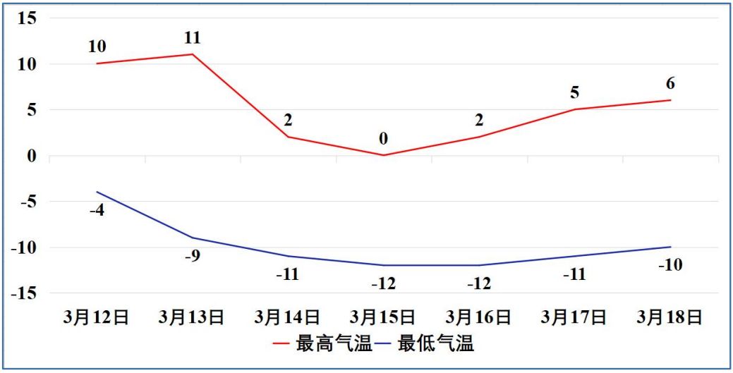 降温:12至13日,新区气温较高,最高气温10~11℃。预计14至15日,最高气温降幅较大,下降11℃,最高气温降至0℃;最低气温下降8℃,最低气温出现在15、16日清晨,最低气温降至-12℃(图3)。