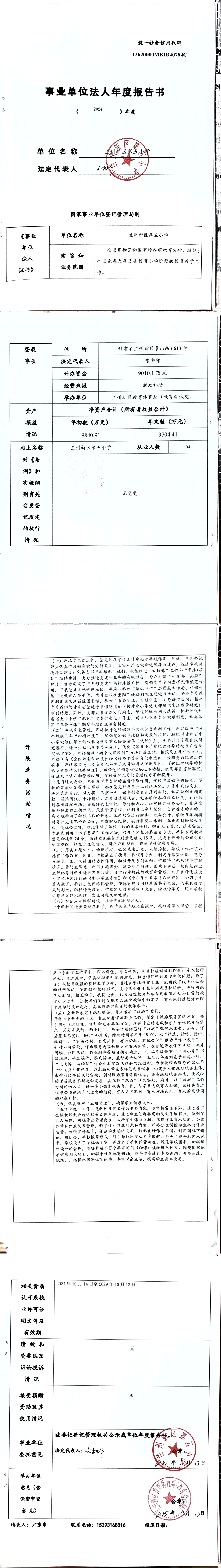 兰州新区第五小学2024年事业单位法人年度报告书