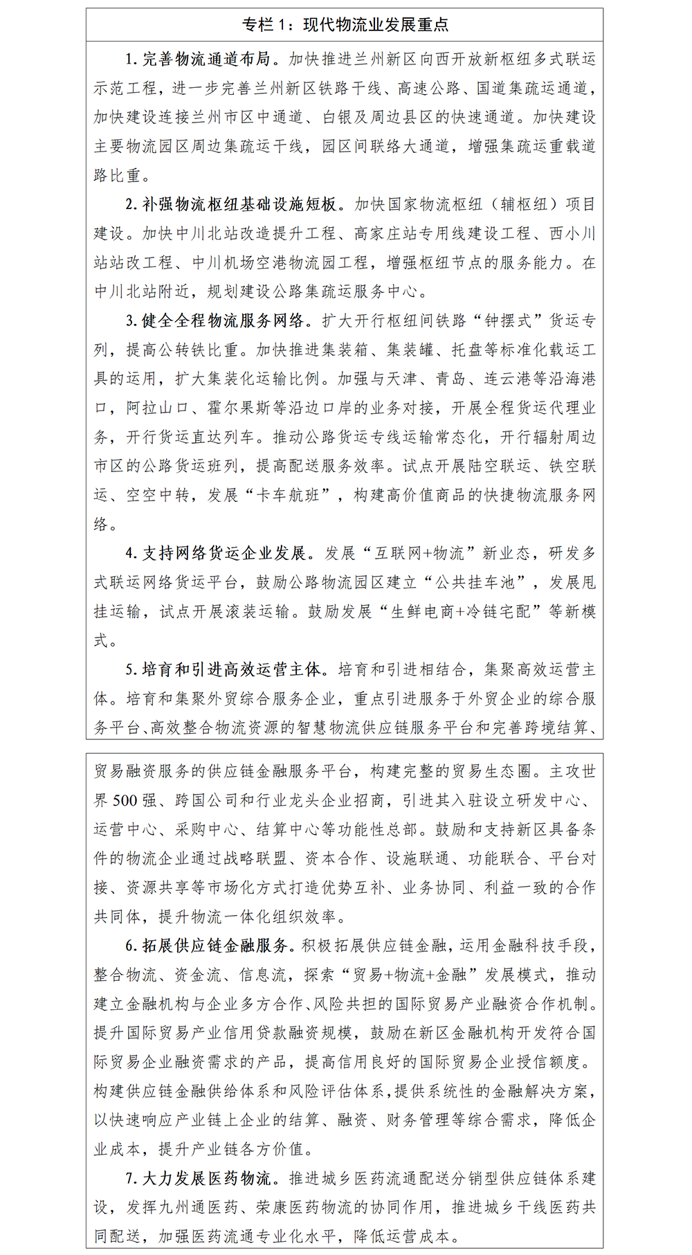 打造高效的物流枢纽运营体系。依托新区“一区、两港、六大指定监管场地、两个跨境电商监管中心”,围绕“区港一体化”发展,加快建设通道物流重点项目、不断提高综合保税区、铁路航空口岸及物流产业园运营水平。加快发展航空物流。依托兰州国际空港打造航空物流枢纽,大力发展卡航一体化物流联运业务,试点开展航空高铁快运邮件联运业务。在巩固既有8条国际货运包机、3条国际客运腹舱带货航线的基础上,积极拓展航空货运包机目的地和腹舱带货航线。鼓励国际国内航空快递企业入驻航空物流园区国际快件中心。鼓励有实力的航空公司在兰设立货运基地,并依托直飞货运航线资源,大力发展“卡车航班”等多式联运方式。积极发展高铁物流。加强与阿里巴巴、菜鸟、京东、圆通等快递公司对接联系,依托高铁南站发展高铁快运物流,谋划建设快递物流园,打造区域快递分拨中心和配送中心。