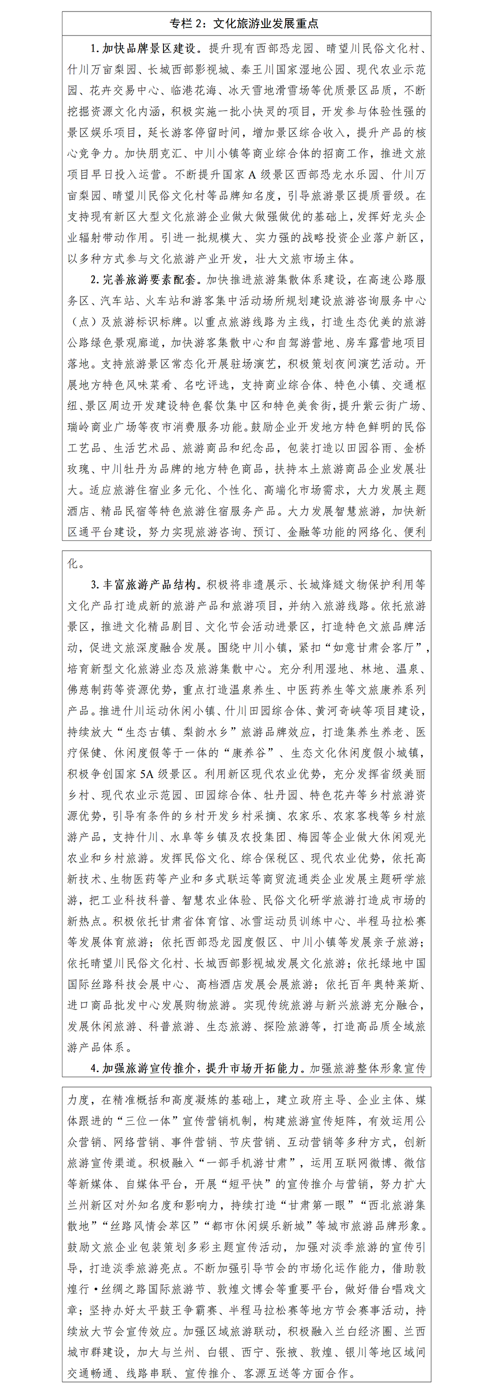着力打造文化旅游核心吸引物。坚持规划先行,高起点编制全域旅游发展、景区建设性规划。打造主题旅游项目集群,注重全季节体验、全产业发展、全方位服务、全社会参与,全面推动景区软硬件服务的跃升。加快西部恐龙园二期、晴望川民俗文化村、中川小镇、恒裕文化旅游综合体等重点文化旅游项目建设。积极推进栖霞湖、湿地公园等景区改造提升工程,打造兰州新区生态休闲的核心地带。坚持文化旅游产业招大商,围绕主题乐园、康养会展、自驾营地、特色民宿、精品剧目等重点,积极引进建设一批具有核心竞争力,参与性、体验性、娱乐性强的文旅项目;大力发展观光、体验、养生、休闲等相结合的高品质复合型产品,着力打造文化旅游核心引爆点。启动省级全域旅游示范区和省级旅游度假区创建,推进区域内资源、产品、业态和产业融合发展,构筑共建共享、相融相促的旅游发展新格局。