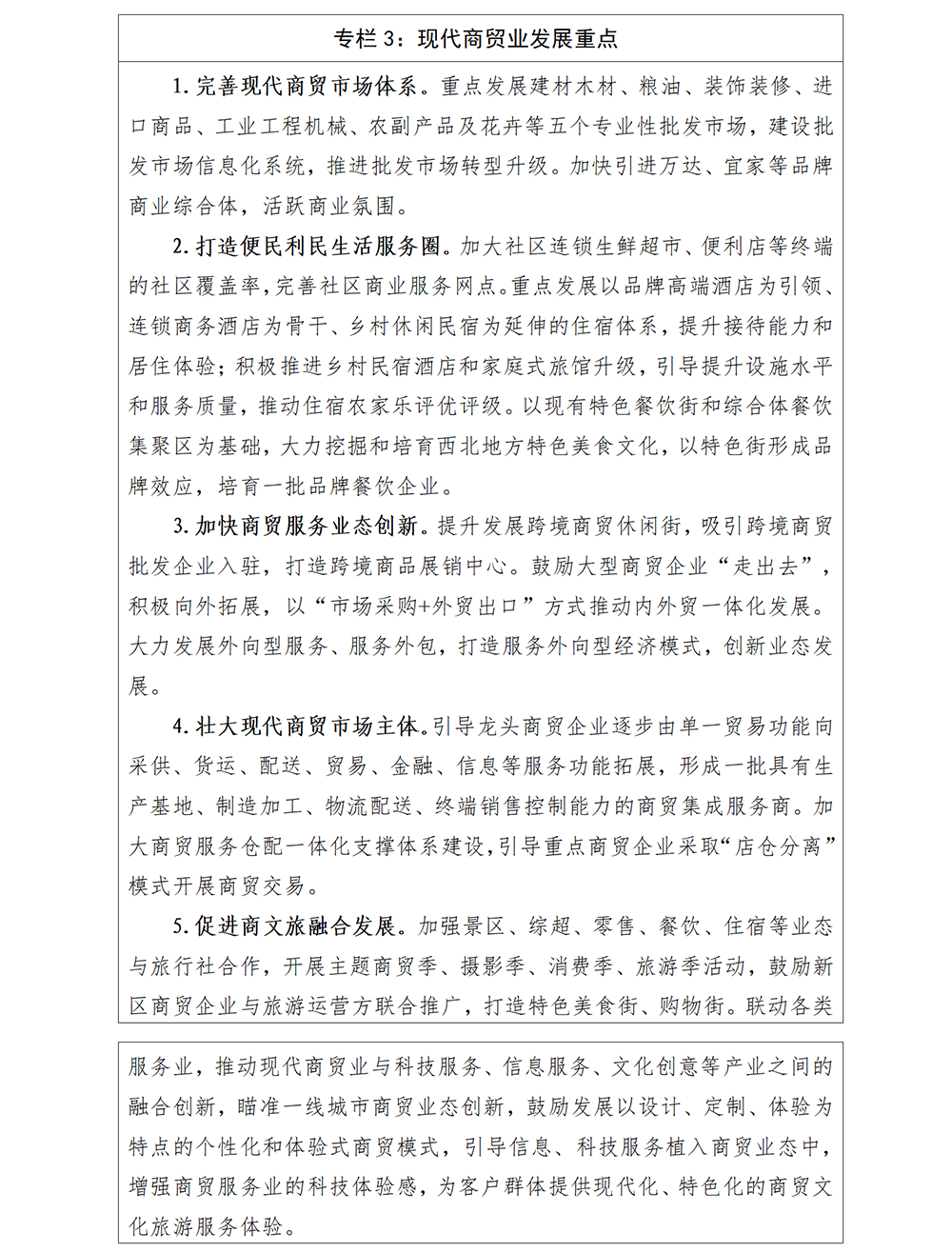 加强商贸服务中心建设。以中川园区为主体,建设高等级商贸综合体写字楼,加强商贸会展、企业管理服务、法律服务、咨询与调查、广告业、职业中介服务等行业的一条龙服务体系建设,配套建设餐饮、住宿等服务设施,提高商贸服务能级。在主要社区、街道打造15分钟生活圈标准化生活服务设施,大力发展连锁超市、电子商务和网上商城等新型零售业态,提高居民便利化服务水平。
