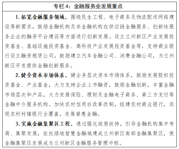 争取设立兰州新区绿色发展银行。加大对兰州新区重大工程项目支持力度。研究建立金融资产交易平台等金融基础设施,筹建兰州新区产权股权交易所,支持股权众筹融资等创新业务先行先试。有序推进金融科技领域前沿性研究成果在兰州新区率先落地,建设高标准、高技术含量的兰州新区金融科技中心。鼓励银行业金融机构加强与外部投资机构合作,在兰州新区开展相关业务。