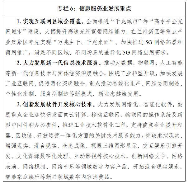 “十四五”期间信息服务业年均增长达到31%。到2025,信息服务业增加值达到13亿元,数据信息核心产业产值达到57亿元,建成30万个机架,培育形成3—5家主业突出、创新力强、带动力强的数据信息创新型领军企业,数据信息高新技术企业达5家以上,创新平台10个以上。打造西北机架规模最大的数据中心,争取成为国家西部数据中心集群弹性节点,纳入全国一体化大数据中心国家节点和重点区域集群。