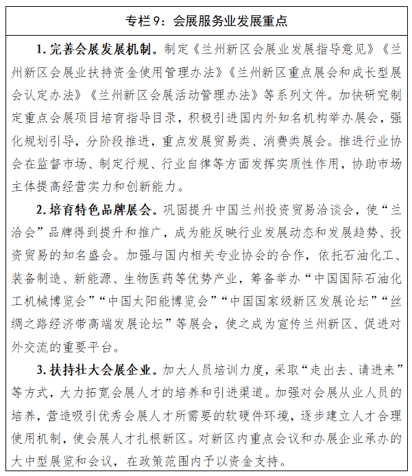 加快会展设施建设。学习国内外成功节庆活动的运作经验,积极应对国内外会展业规模化、品牌化发展趋势,采取先期政府投入和主导,后期市场化运作的方式,加快以兰州新区绿地国际会展中心、兰州新区石化展览馆、甘肃省体育馆、兰州新区文化艺术中心等为载体的会展活动开展,逐步夯实会展业发展基础。建设国际会展中心、大型会议中心。通过举办新能源、高端装备、生物医药、电子信息、汽车等大型专业展会,提升新区国际影响力。