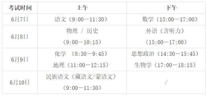 考试时间安排在6月7日-6月10日。语文科目考试时长为150分钟,数学和外语(含听力)科目考试时长均为120分钟,外语听力考试(30分钟)安排在外语笔试考试开始前进行,选择性考试科目(以下简称“选考科目”)考试时长均为75分钟。考生3门统一高考科目和3门选考科目全部使用国家通用语言文字答卷。报考少数民族语言授课专业的考生还须参加相应民族语文科目全省统一考试,考试时长为150分钟。具体时间安排如下: