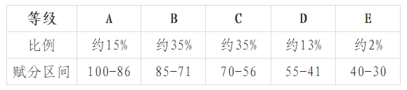 再选科目每科原始分满分100分,转换时以30分作为等级转换的赋分起点,满分100分。将考生每门再选科目的原始成绩从高到低划定为a、b、c、d、e五个等级,各等级人数所占比例分别约为15%、35%、35%、13%和2%。转换时,将a至e等级内的考生原始成绩,依照等比例转换法则,分别转换到100-86分、85-71分、70-56分、55-41分、40-30分五个等级分数区间。根据转换公式计算,四舍五入取整得到考生的等级成绩。再选科目成绩计入高考总成绩的等级比例和赋分区间如下: