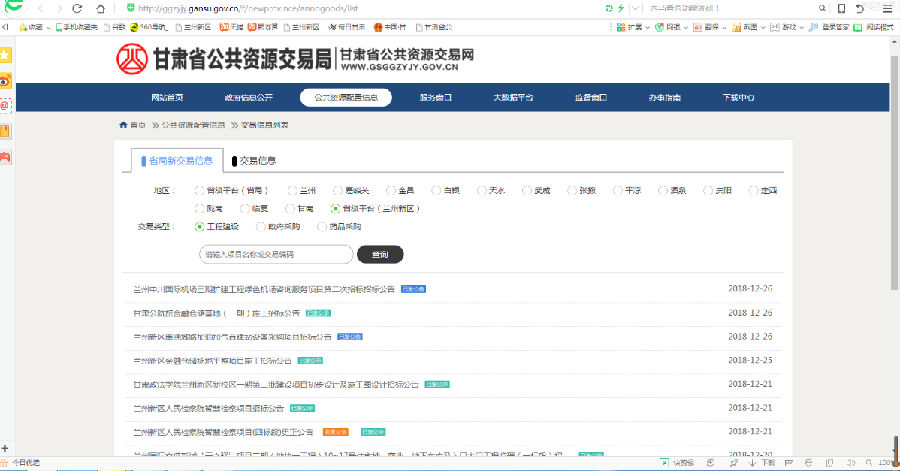 5.公共资源配置领域信息公开情况。坚持公共资源配置信息全公开,针对公共资源交易决策、执行、管理、服务、结果五个环节,兰州新区严格对照《甘肃省公共资源交易信息公开目录》,统一在甘肃省公共资源交易网(http://ggzyjy.gansu.gov.cn/)公开发布兰州新区公共资源配置信息,全网公开了11大类、62分项、472小项的交易信息,社会公众可“一站式”获取所有公开信息。2018年全年,在省公共资源交易网公开交易信息500批次。其中,工程建设项目389批次,政府采购项目111批次。项目信息、公告信息(资格预审公告信息)、资格预审结果公示、专家抽取申请信息、开评标信息、公示信息、保证金退还信息、变更信息等均在甘肃省公共资源交易网及时进行了公开发布。