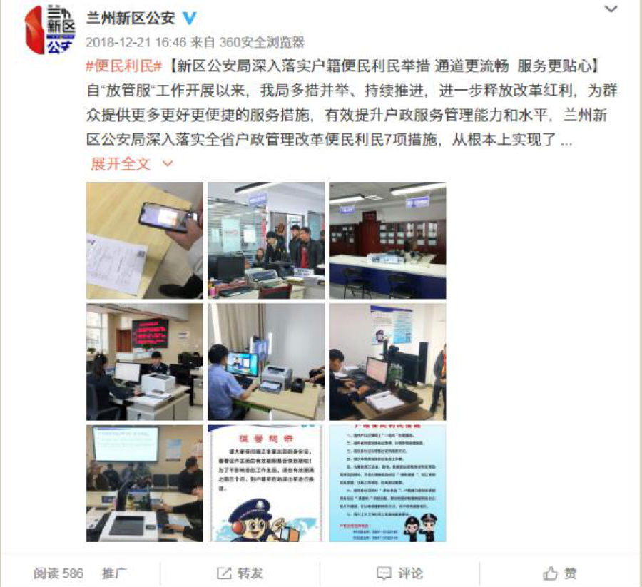 6.社会治安领域信息公开情况。有效利用“互联网 政务 警务”模式,推出微信实名认证办理宾馆临宿人员登记、开具无违法犯罪证明、零散加油证明及有奖违法举报等互联网警务服务功能。同时,积极梳理户籍、出入境、执法办案等5方面114项创新改革举措,压缩办事时限246个工作日,缩减材料93份,大力实行人才落户“绿色通道”,为新区人才落户、境外人才签证等提供了优质高效的户籍服务。