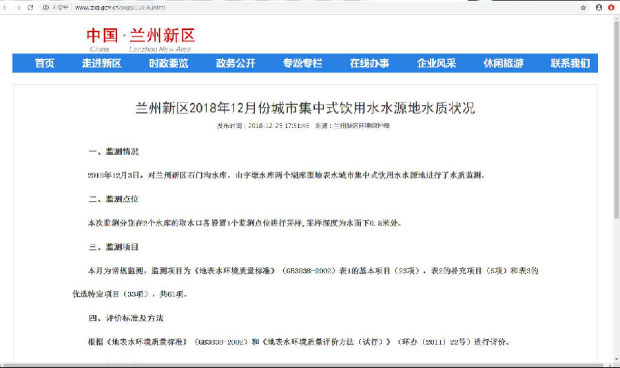 五是主动公开环保领域信息。进一步做好社会广泛关注的大气污染防治、水污染防治、土壤污染防治等信息公开工作。在政府网站逐月公示兰州新区城市集中式生活饮用水水源地水质状况,并先后发布了甘肃省第一环保督察组进驻兰州新区督察公告、兰州新区土壤污染地块情况公示以及关于拟作出尚方堂现代中药与大健康产业园项目(一期)和兰州新区高分子防水新材料产业基地项目环境影响评价文件审批意见的公示。及时公开建设项目环评审批信息,全年在甘肃政务服务网兰州新区子站受理公示建设项目环评文件45件,共96个项目。及时公开环境管理政务信息,全年公示环境行政处罚案件5件。